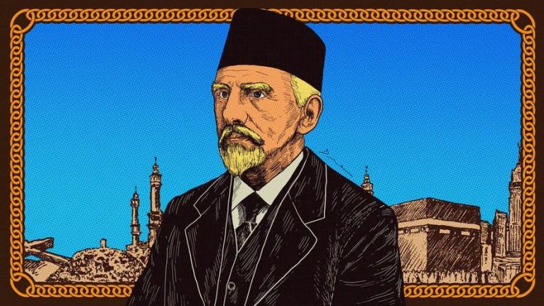 | Christiaan Snouck Hurgronje berdiri di belakangnya dengan jaket putih dan fez (kopyah khas Turki) di kepalanya data di konsulat Belanda di Jeddah |